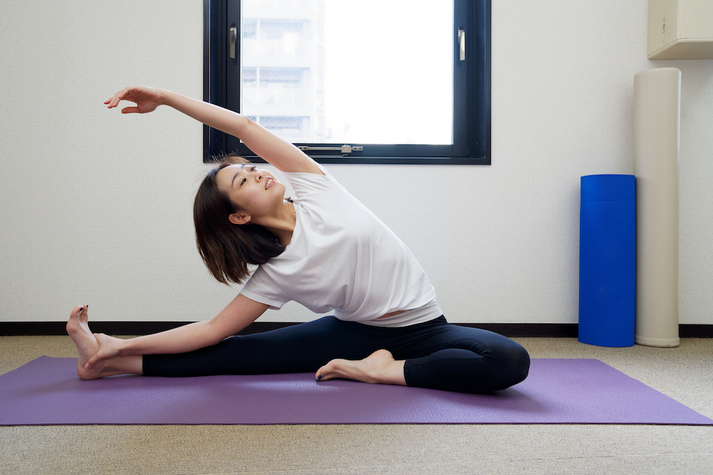 マシーンを使わずに鏡を見ながら、自重で動いていただきます。ピラティスは呼吸をしながら体幹のインナーマッスルを起動させ、良い姿勢を知っていただくために。弱くなったり、使えなくなっている筋肉は筋トレで、硬くなったりコリを感じている場所はストレッチでアプローチし、姿勢を整えていきます。特に、パーソナルストレッチは寝たままでトレーナーがストレッチをかけるので、体が硬い人でもリラックスして筋肉を伸ばすことができます。